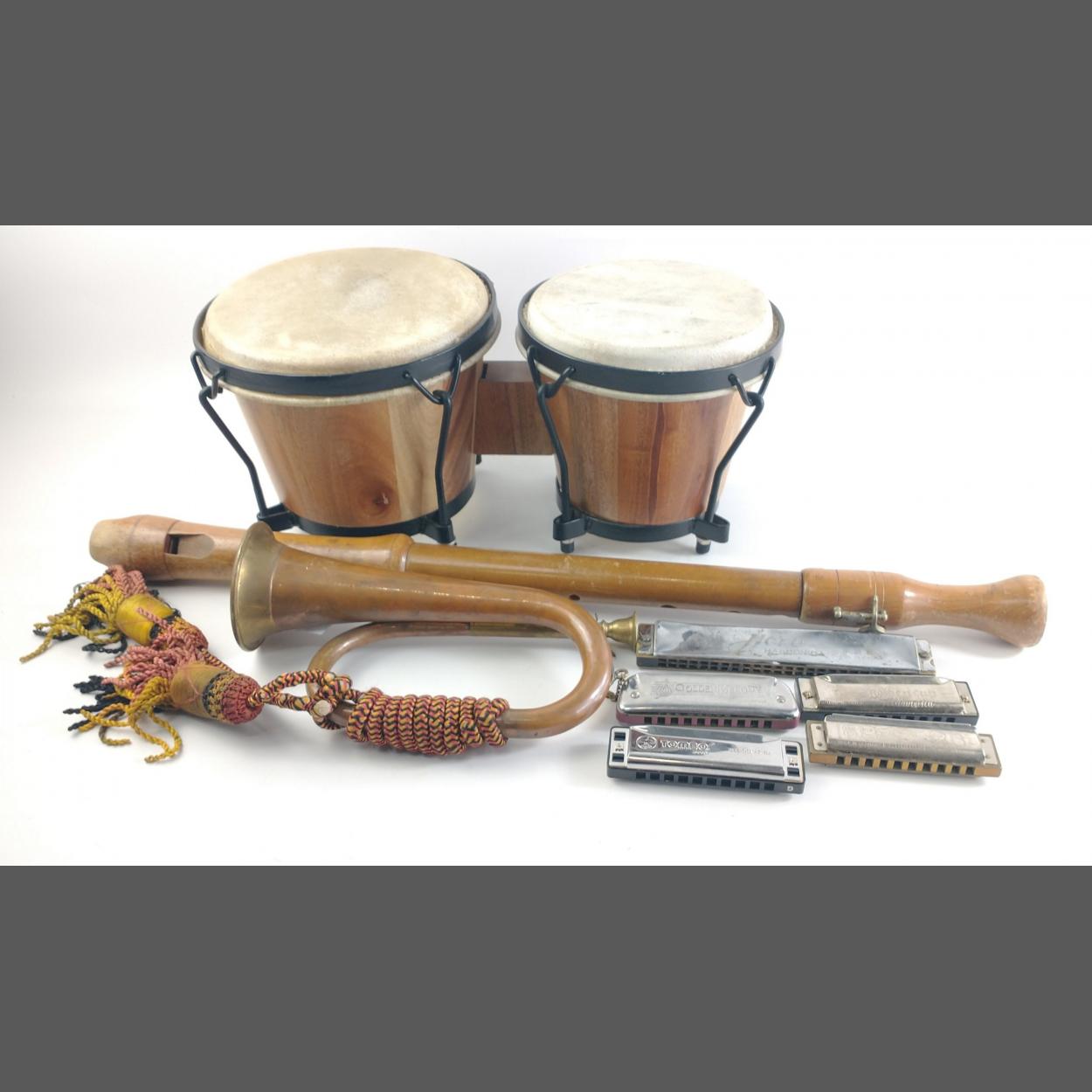 A collection of musical instruments to include a tenor recorder, a copper and brass hunting horn, 5 harmonicas including Hohner, Tombo, Golden Melody (Hohner),and a set of bongo drums,