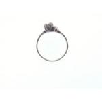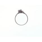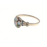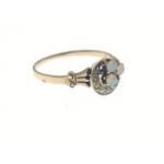 A ladies dress ring with indistinct 18 stamp, set with 3 small opals on a coronet shoulder, size Q, gross weight 1.95g approx