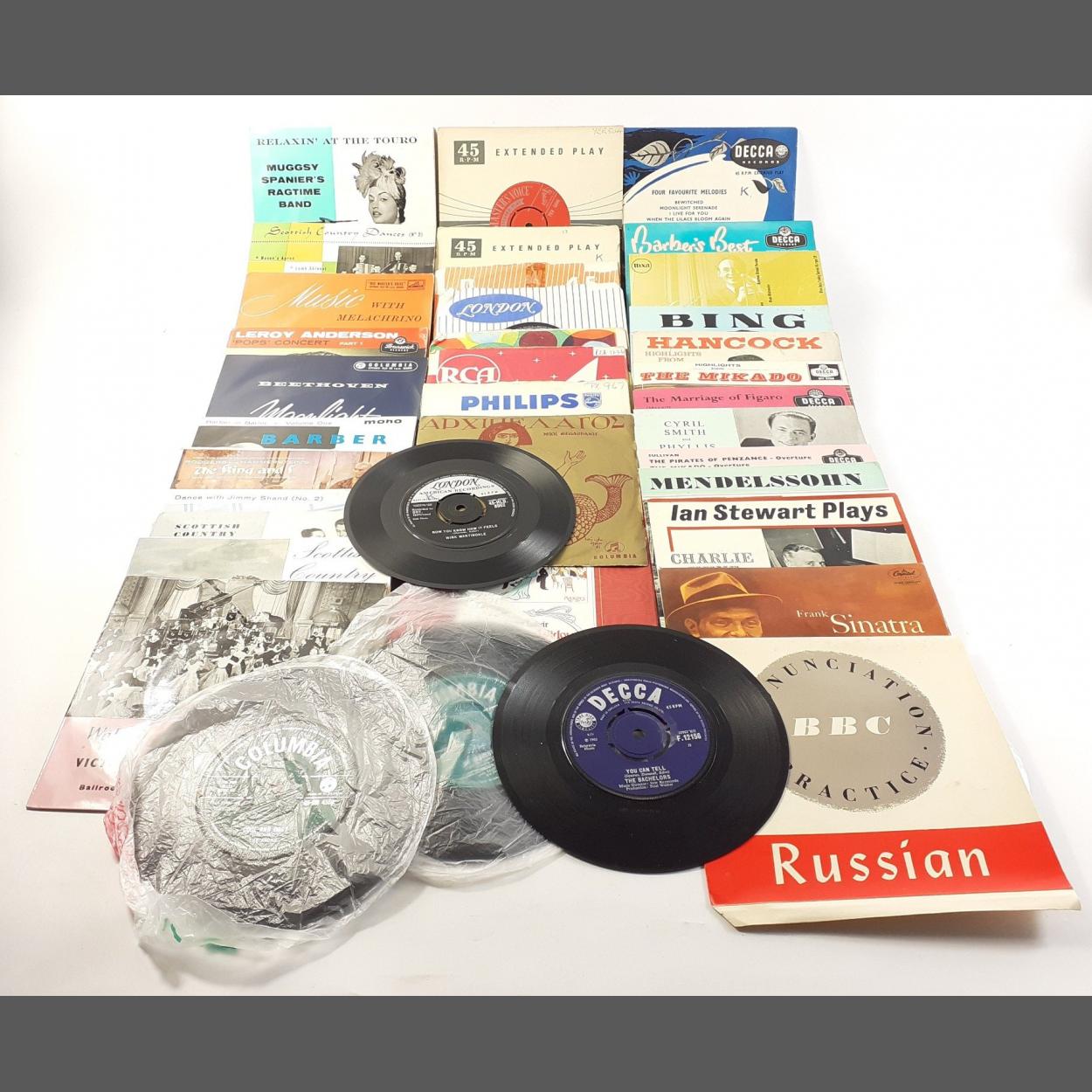 A collection of 45rpm vinyl records to include THE MERRY WIDOW signed by ELIZABETH HARWOOD, MELACHRINO, MUGGSY SPANIER'S RAGTIME BAND, JIMMY SHAND, many musicals and others