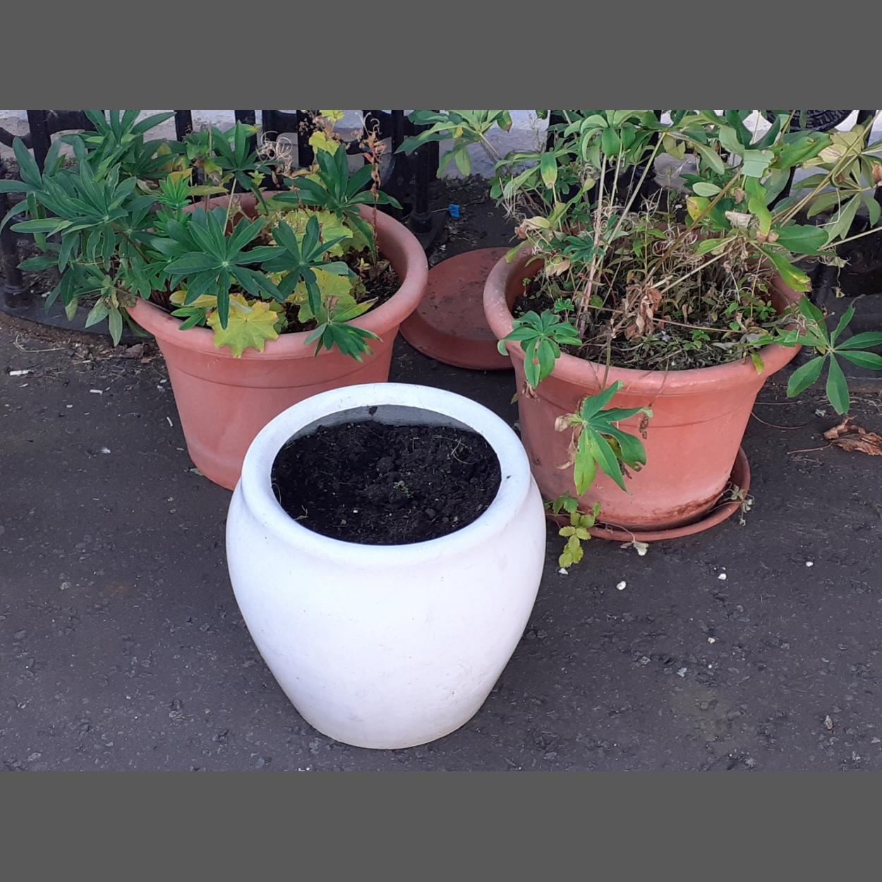 THREE large resin garden planters to include two terracotta style planters with planting (both peony roses) - height just over 1ft each approx