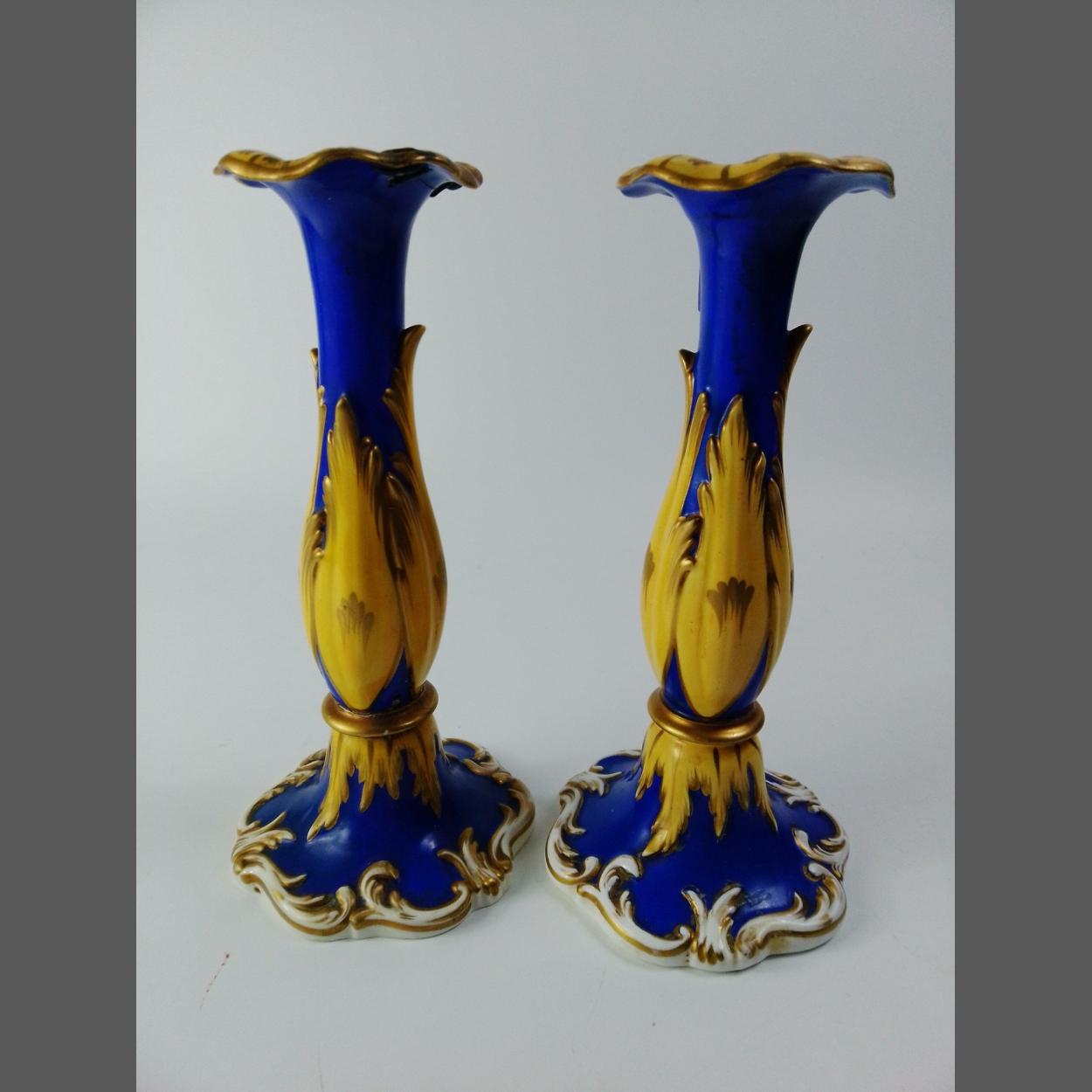 A pair of STUNNING antique c1870's candlesticks, brightly decorated blue ground with apricot, white and highlighted in gold - one of the candlesticks has a gold handpainted 'p' to the base, one has seen some historical damage repair with two professional repairs with staples on the rim, and a 'bolted stem repair' to the base (see pics) - dimensions 25cm tall x base diameter 12cm approx