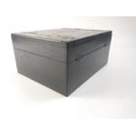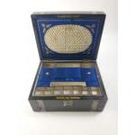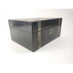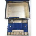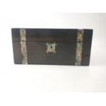 A large dark wood jewellery box (30x22x14cm approx) with a mother of pearl decorative band (several pieces missing). Two interior shelves lined in blue satin.