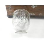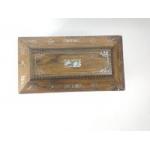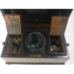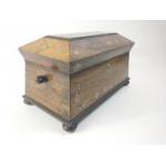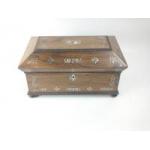 An antique wooden sarcophagus shaped tea caddy decorated with mother of pearl inlay, retains both interior caddies and cut-glass crystal mixing bowl. Measures 33x18x18cm approx. Currently used as a button box. Beautiful piece