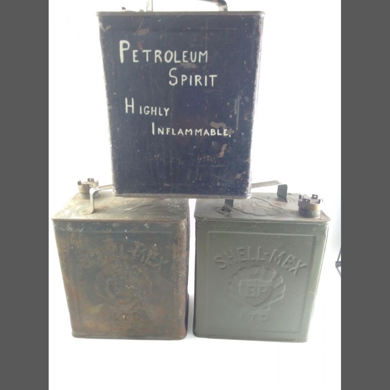 Two SCOTTISH OILS and SHELL-MEX petrol cans with caps in original condition plus 1 other