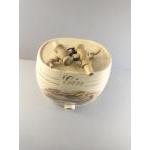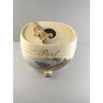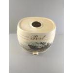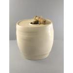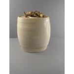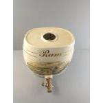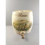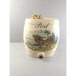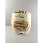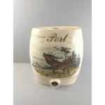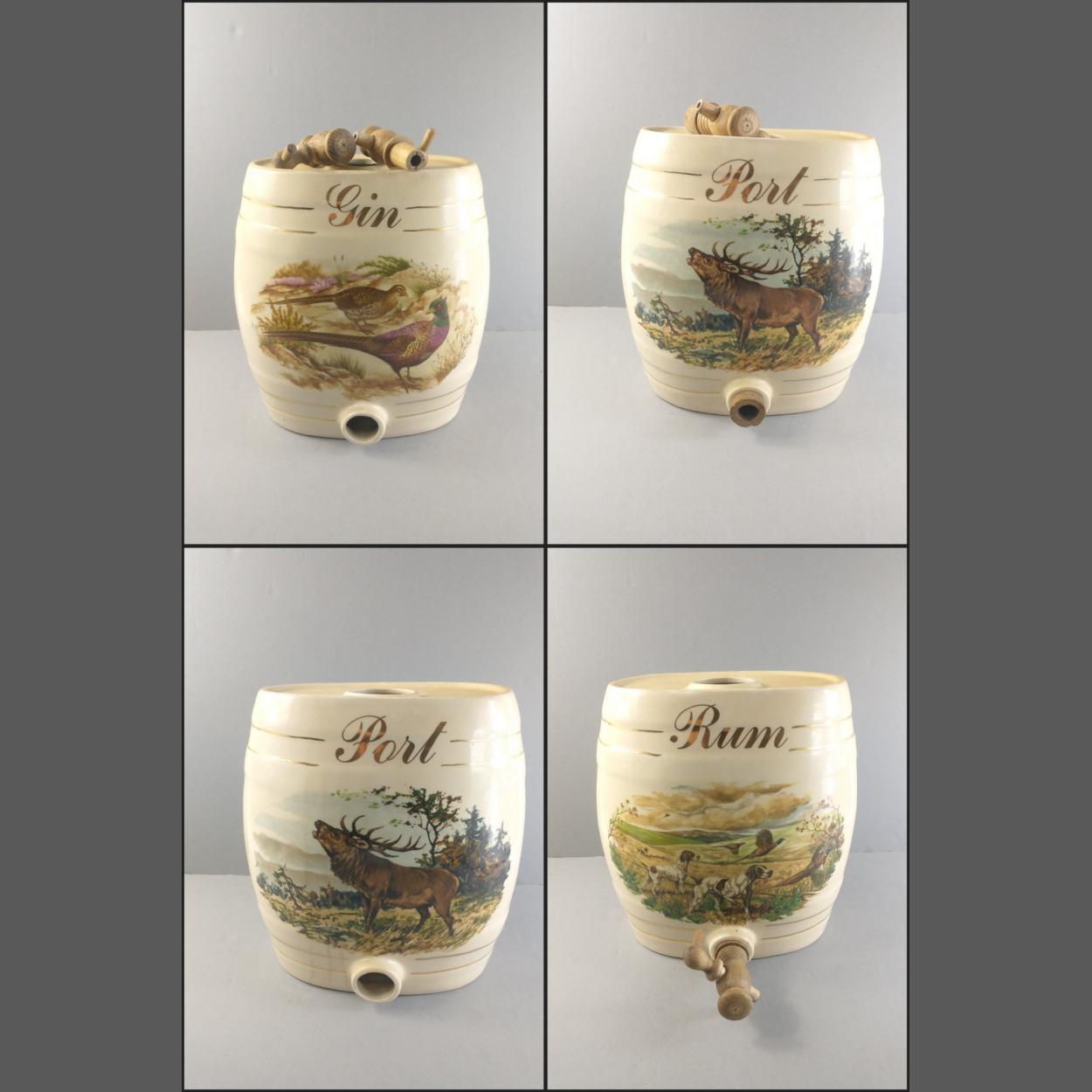Four large ceramic barrels labelled gin, rum, and 2 x port, decorated with countryside scenes of pheasants, hunting dogs and a stag. Each stands 30cm tall. Each has its spigot but is missing the bung for the top of the barrel. Attractive decorative pieces