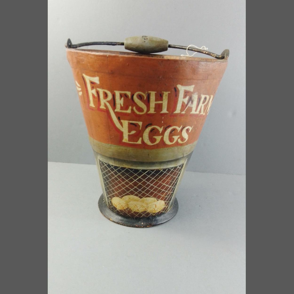 A wooden pail decorated with label 'Fresh Farm Eggs', stands 25cm high approx
