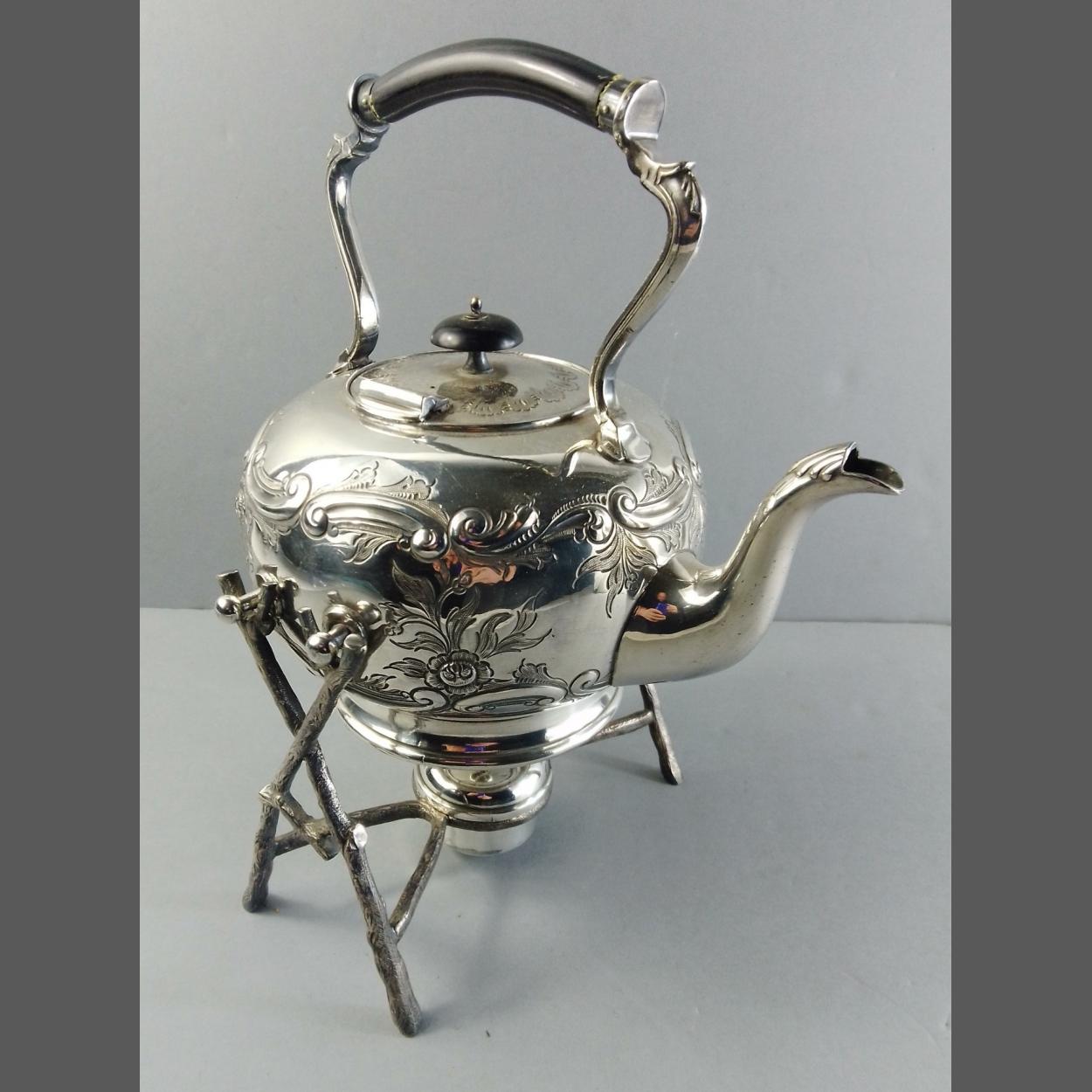 A quality silver plated spirit kettle on stand complete with burner