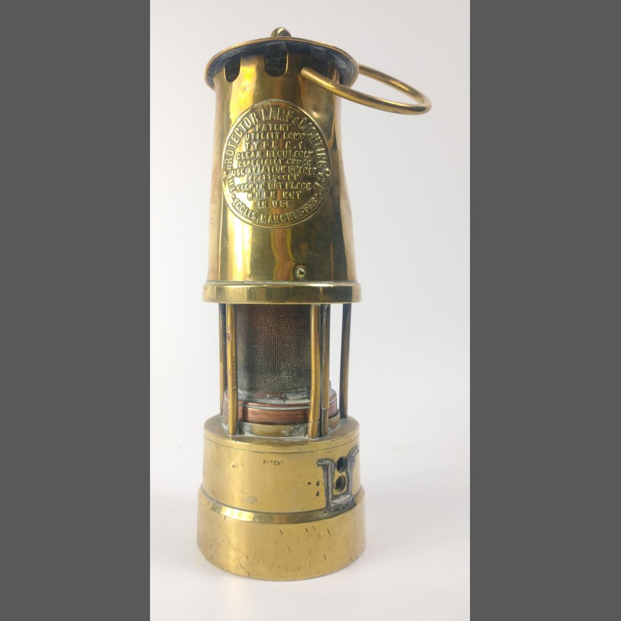 A brass ECCLES Miners Protector Lamp. With dents and wear, no glass. 25cm tall approx.