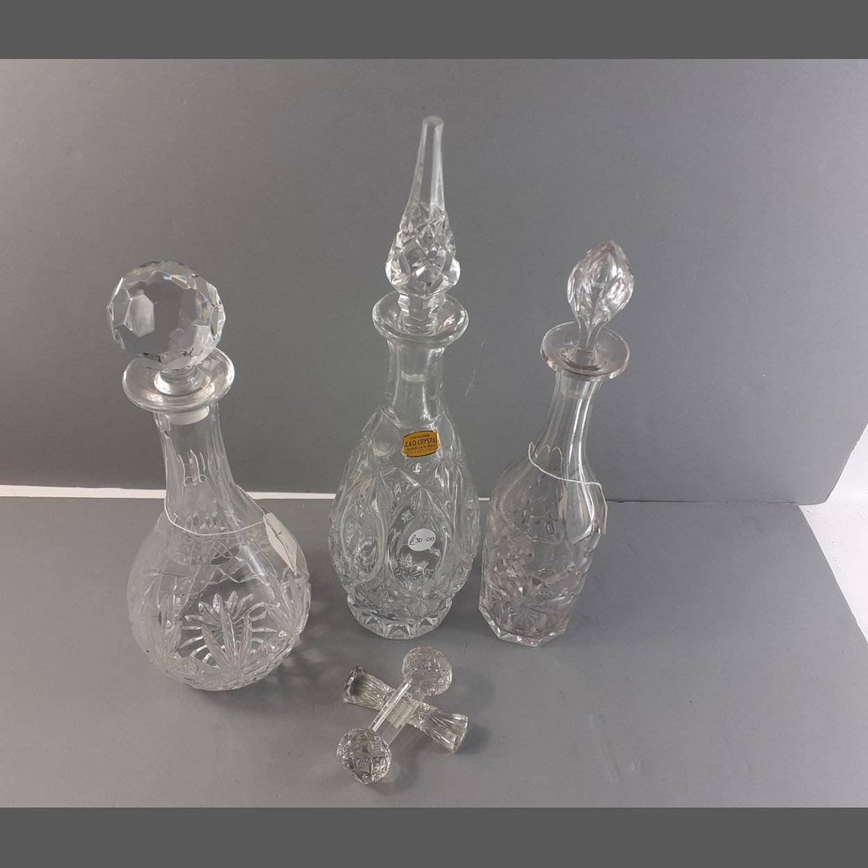 One crystal and two cut-glass decanters and a pair of knife rests. Tallest decanter 39cm approx