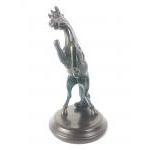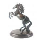A rearing cast metal stallion on a plinth, stands 30cm approx