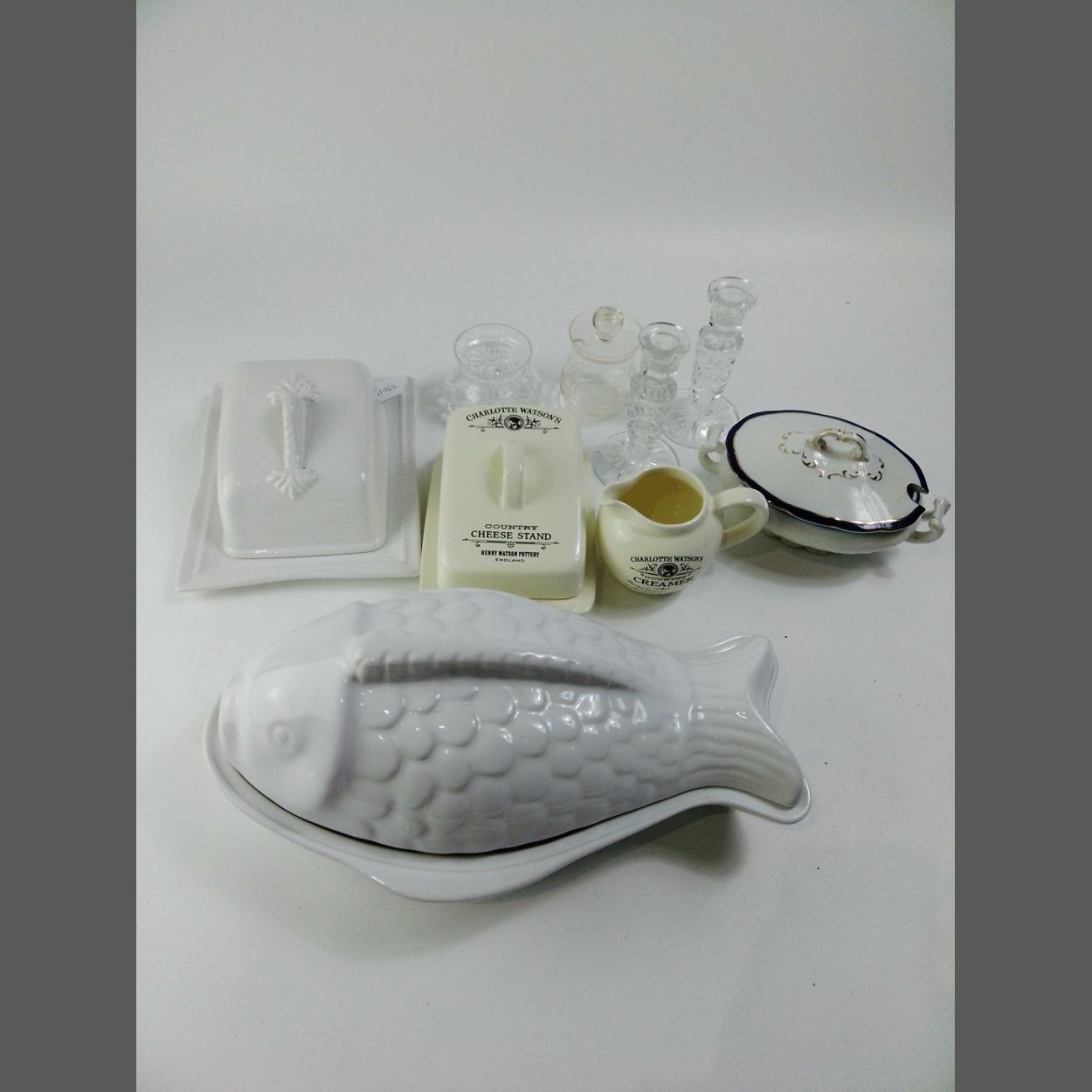 A quality collection of ceramics to include a CHARLOTTE WATSON cheese dish dimensions 9cm length x 15cm width x 8cm tall approx and cream jug, a pair of glass moulded candlesticks, a white lidded fish dish etc with