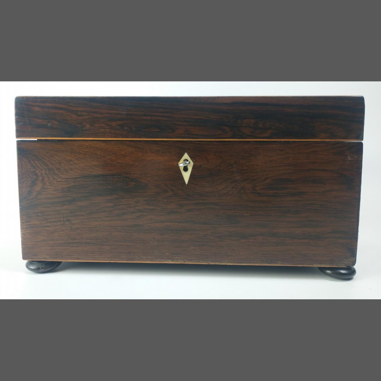An antique tea caddy. Interior complete with 2 side caskets and central cut glass mixing bowl. With lion's head handles, 4 bun feet, with key and working lock. 31x15x16cm approx