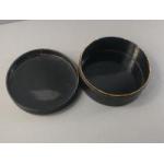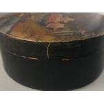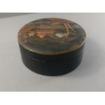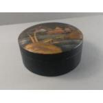 A black lacquered round box with an Japanese design with Mount Fuji in the background, diameter 18cm x 7cm height