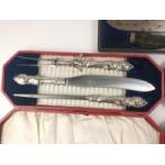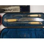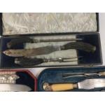 A cased antique silver collared WALKER & HALL carving set Sheffield 1920. Horn handled with steel blades and silver collars and finials, the set could do with cleaning. Lot includes two other similar boxed sets but in steel.