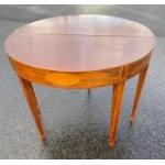 A late 19th century drop-leaf demi-lune table with inlay - nice quality! 95cm fully opened x 45cm depth - height 73cm approx. The table has had small historical repairs at both top hinges to splits in the wood, this does not detract from the overall look of the piece