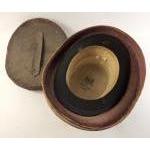 An antique silk-lined leather hat box with wear, containing a J. HUME 'Ye Old Hattery of HAWICK' top hat 53cm approx