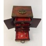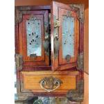 An exquisite Oriental brass banded and inlaid jewellery box with intriguing little drawers and pretty handles stands 21cm high approx