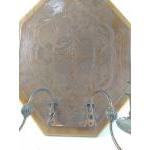 A most unusual wooden wall plaque with an attractive copper design plate and 2 copper candlesticks, measures 43x35cm approx
