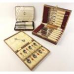 Three good quality boxed sets of silver plated flatware to include, Christies of Edinburgh butter knife set, coffee bean set which includes an additional spoon made from a Dutch Silver Coin, and a quality knife and fork set.