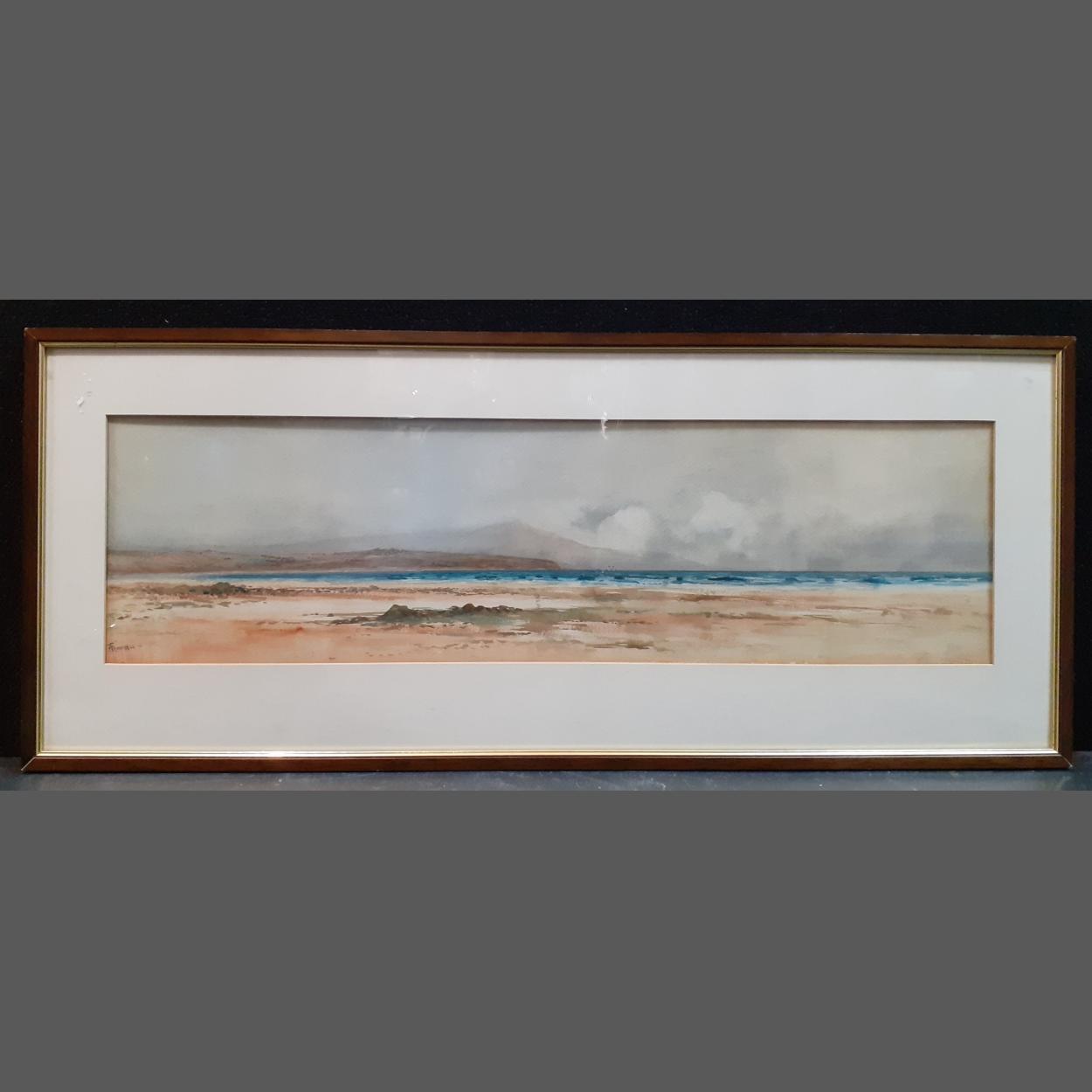 A framed and glazed original water colour by Glasgow born artist F CAMPBELL of a beach scene and islands dimensions 89cm x 37cm approx