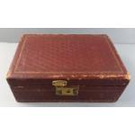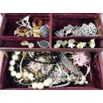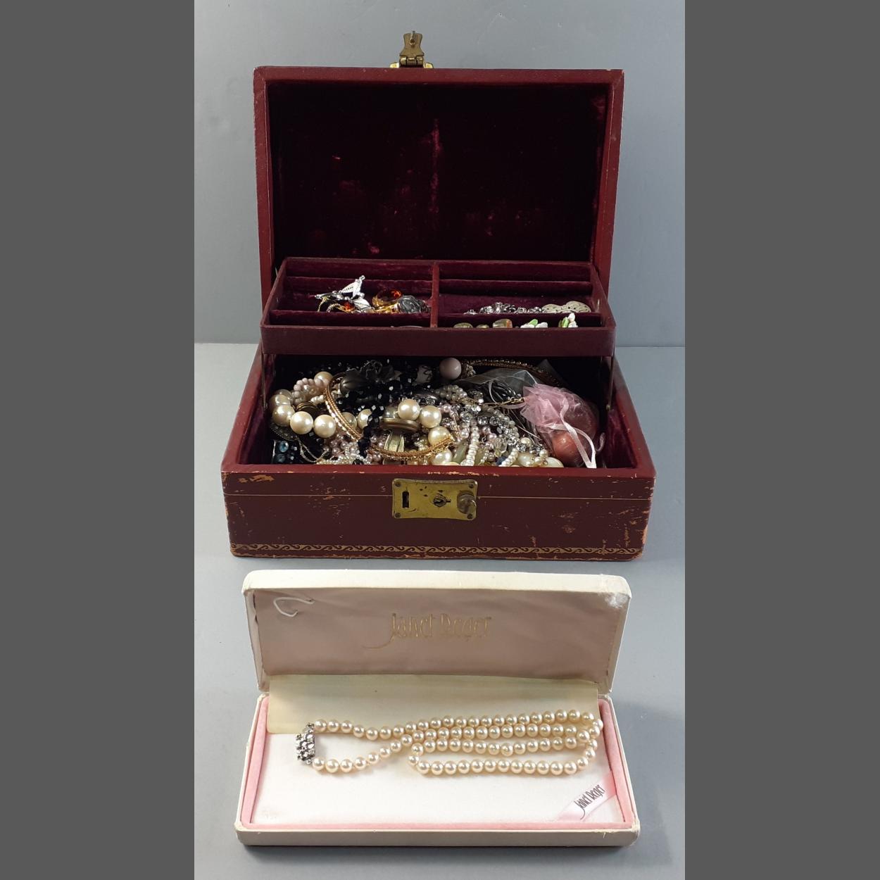 A leather covered jewellery box with canti-levered interior plus contents of many strings of beads including a boxed JANET REGER string of artificial pearls. Box measures 25 x 18 x 9cm approx