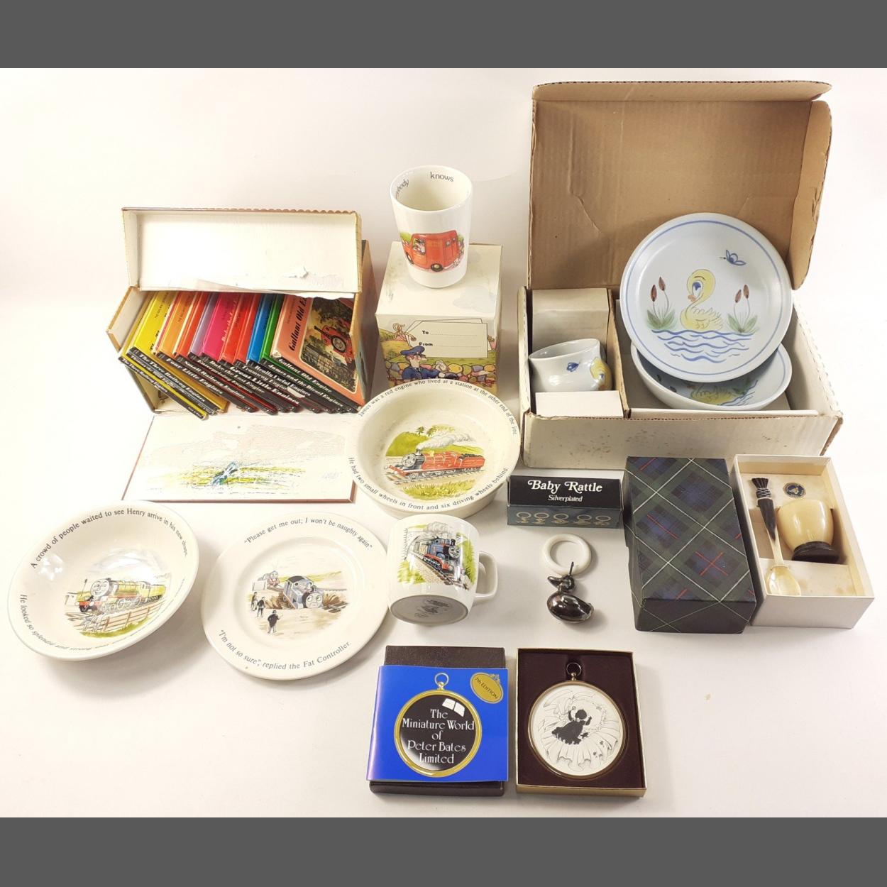 A mixed child's ceramic lot to include WEDGWOOD Thomas the Tank Engine cup, bowl, plate, THISTLE POTTERY child's set, a horn egg cup and spoon, POSTMAN PAT CUP, THOMAS THE TANK ENGINE books etc