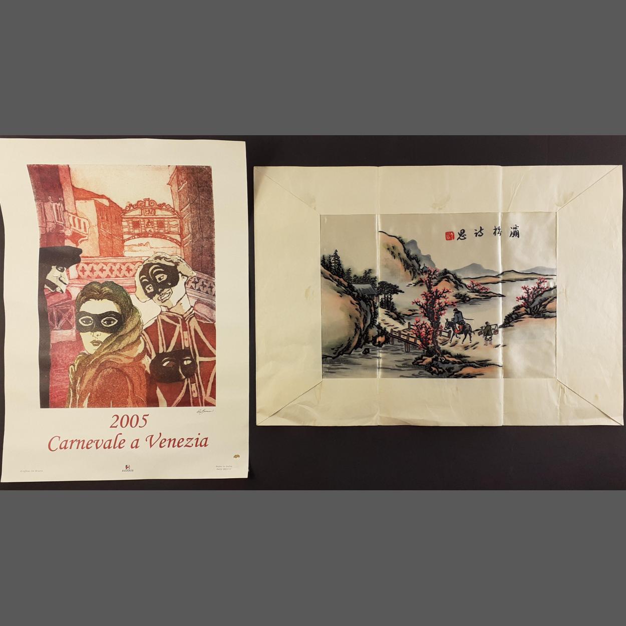 An Oriental silk painting with embroidered highlights 50 x 35cm approx and also a Venice Carnaval 2005 poster 45 x 32cm approx