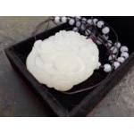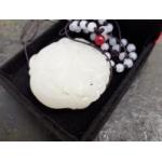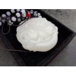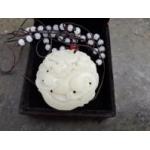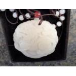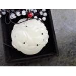 A necklace with jade pendant (50mm dia, 10mm deep) with an Oriental dragon on a chain of beads approx 38cm ago.