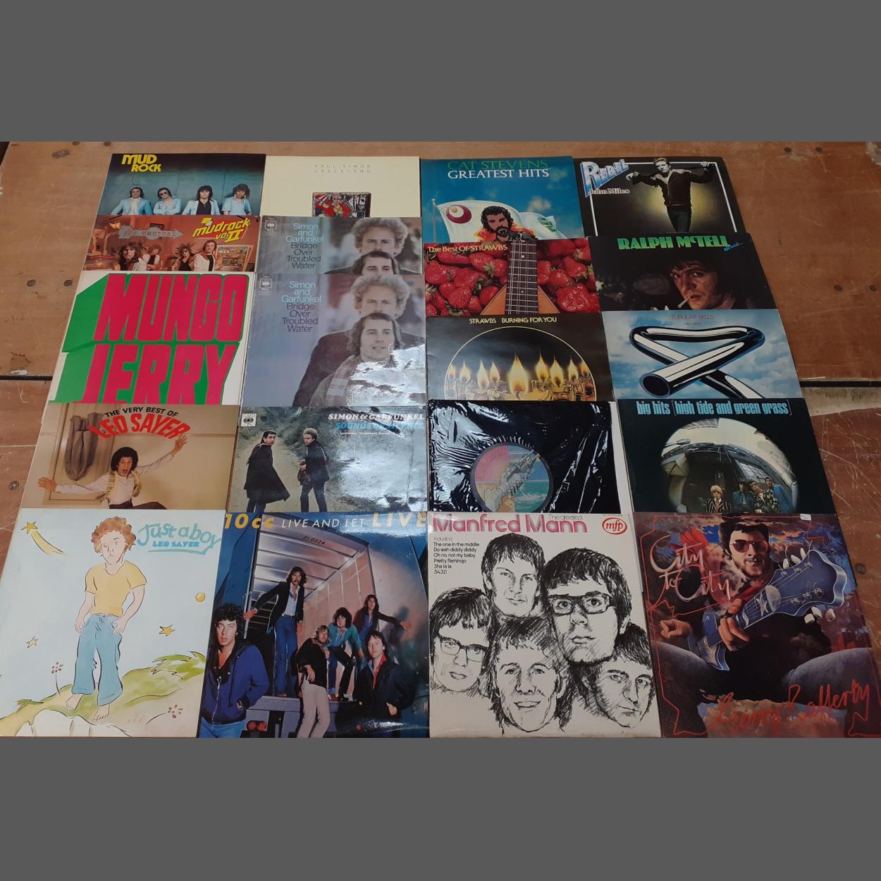 A collection of albums to include MUD, SIMON & GARFUNKEL, PAUL SIMON, LEO SAYER, ROLLING STONES, GERRY RAFFERTY, MIKE OLDFIELD, RALPH McTELL, MANFRED MANN, JOHN MILES, PINK FLOYD (Wish You Were Here), STRAWBS, CAT STEVENS, 10CC. All appear in resaonable well stored condition