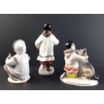 LOMONOSOV made in the USSR INUIT ceramic figurines in traditional dress to include a peasant Eskimo child with a large sturgeon fish, an Eskimo and Husky figure and lastly an Eskimo girl figure - x3 figurines in total - intact and no damage noted - tallest figure 20cm approx