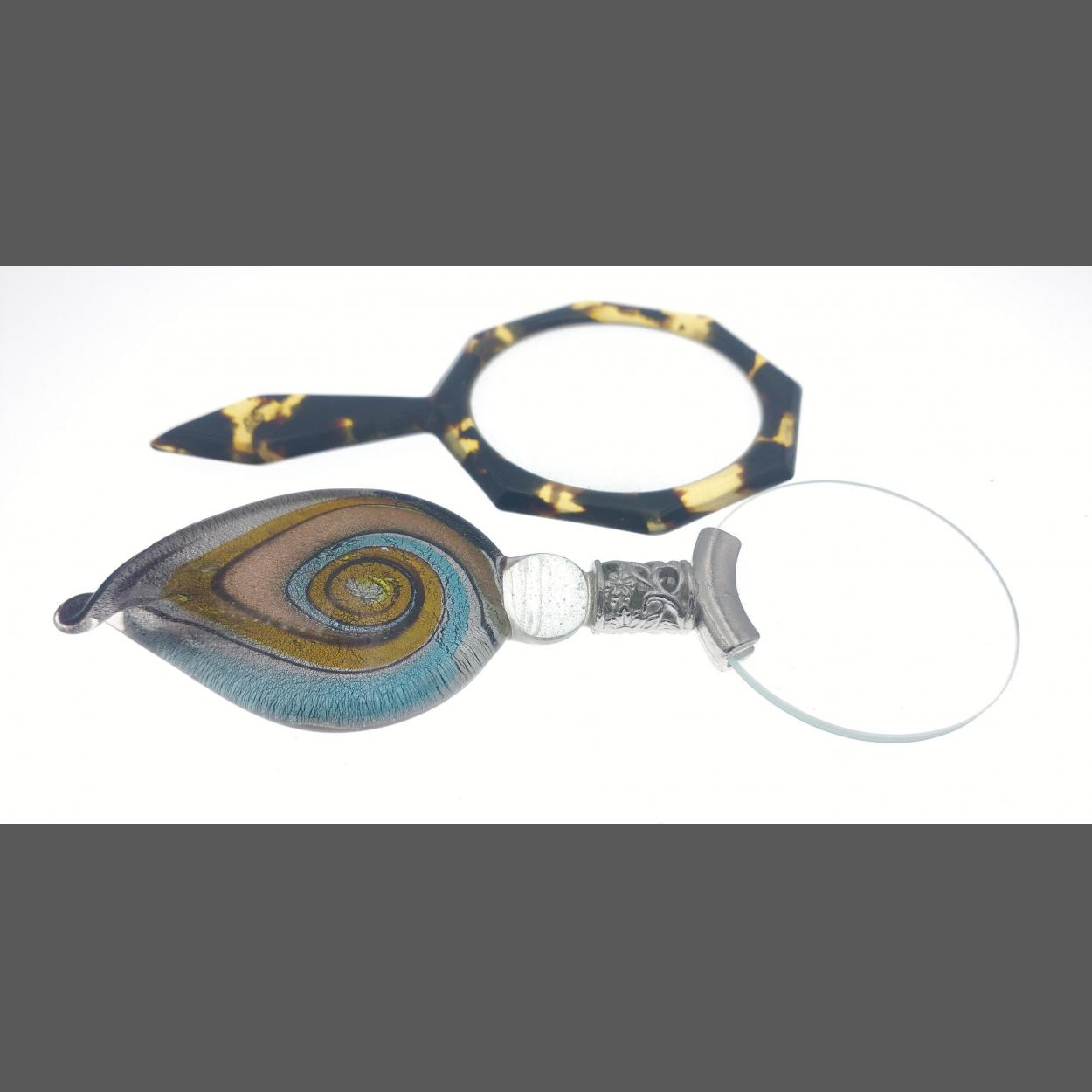 A MURANO style glass handled small hand magnifier with also a tortoise shell handheld magnifying glass