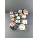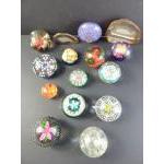 A collection of 13 FABULOUS VINTAGE paperweights of varying sizes to include also two pieces of polished stone, one on a small display stand, largest polished piece is 12.5cm x 9cm approx