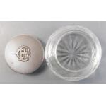A cutglass powder dish with silver hallmarked lid, Birmingham 1959, base of dish 11cm approx, lid 8cm approx with inscription and gilt interior, lid weight 61g approx