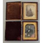 Two matching cased Victorian photos, the gent a tintype and the lady a CDV style, both cases in good order. 12cm x 10cm approx
