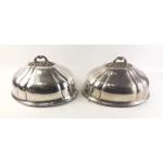 A pair of large stamped AB SAVORY & SONS silver plated meat covers with wear, there are dents on both with a GRYPHON Crest - dimensions of each 35cm length x 28cm width x 20cm height approx