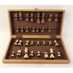 Boxed modern chess set (one pawn missing) in a fold out box with chess board.
