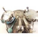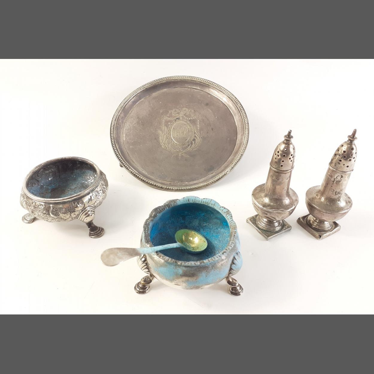 Two silver salt dishes one hallmarked London 1754, the other indistinct, 2 hallmarked cruets, a silver card tray, London 1783 (15cm dia approx), weight 452g aprox
