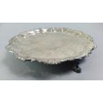 An intricately decorated card tray hallmarked London unclear date, 17cm diameter approx, weight 256g approx