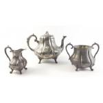 A silver-plated tea service comprising teapot, milk and sugar. Teapot stamped 'Best electro-plate'.