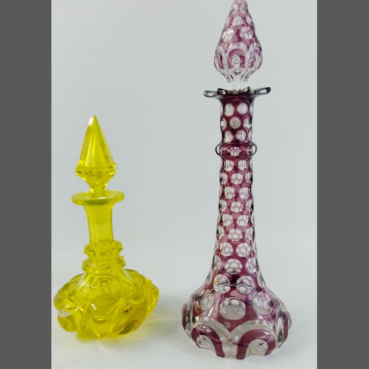 Two pieces of antique Bohemian crystal glass lidded bottles, one in red (29cm approx, stopper broken in neck) and the other in green base (21cm approx) - beautiful pieces!