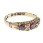 A Victorian 375 stamped Chester hallmark band set with 3 red stones with small diamonds (one missing), size O, gross weight 2.1g approx