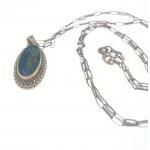 A yellow metal pendant with a stunning centre oval opal (14mm oval) in an unmarked mount with 375 stamped chain (54cm approx). Gross weight 4.5g approx