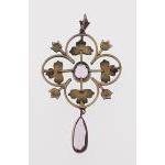 An Edwardian pinchbeck pendant with central amethyst and seed pearls. Lovely piece, 5cm approx, gross weight 4.1g approx