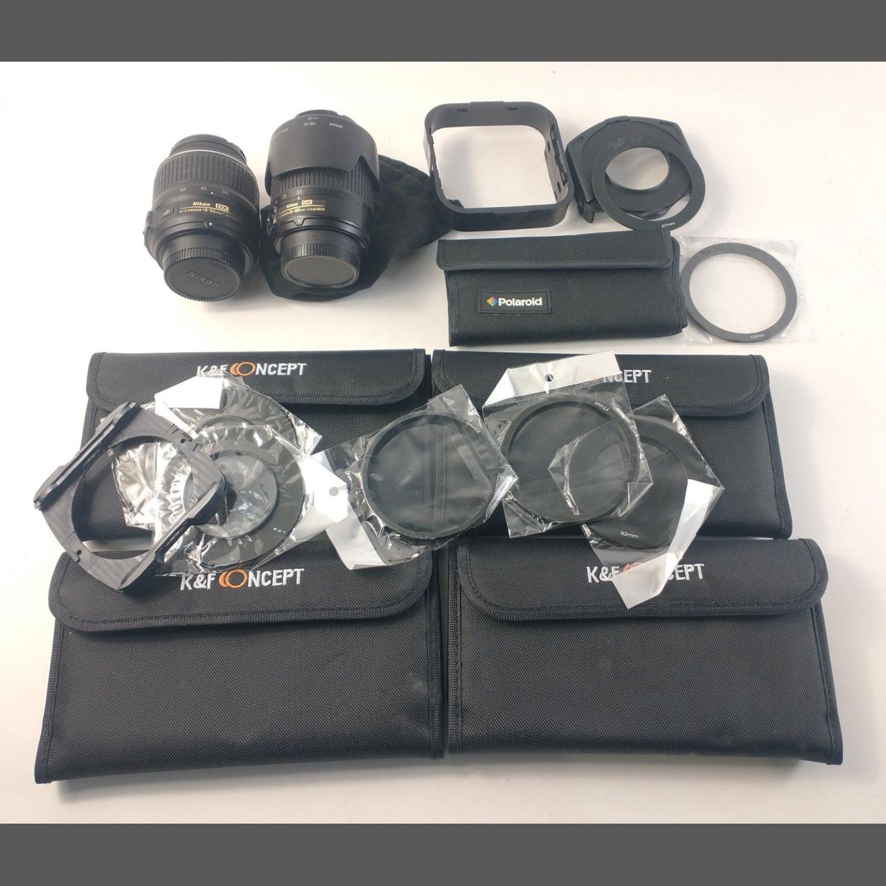 Interesting Photography lot. Includes NIKON DX 55-200mm lens, NIKON DX 18-55mm lens. Both lenses in good clean condition. Also cased sets of filters, rings etc.