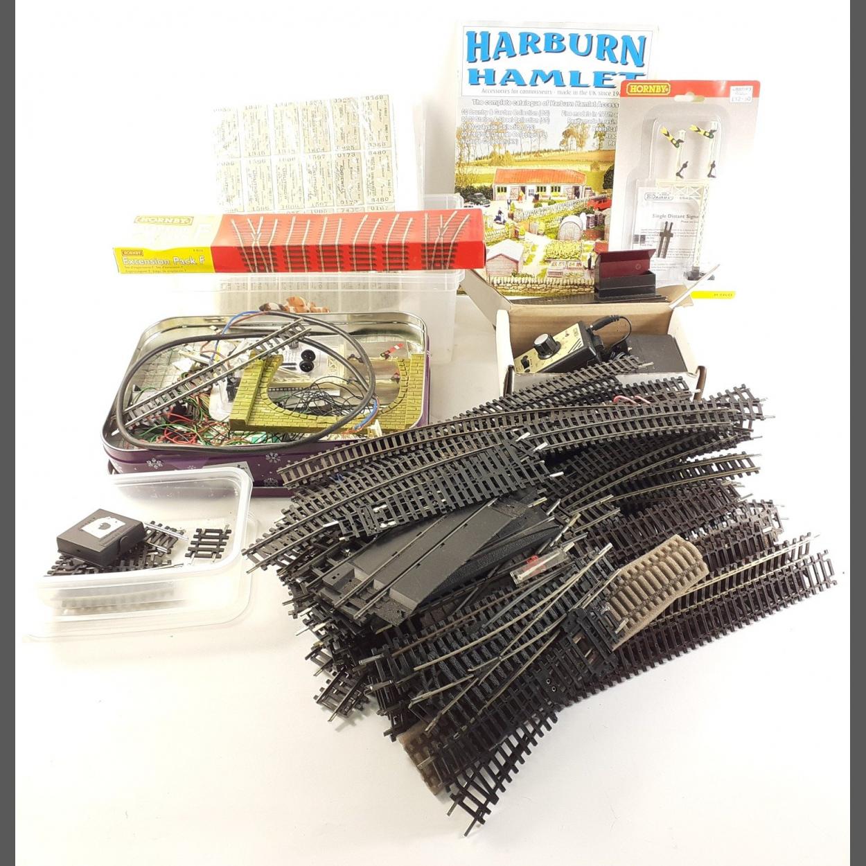 A tub of boxed railway model scenery including Harburn Hamlet and other scenic items including a quantity of railtrack.