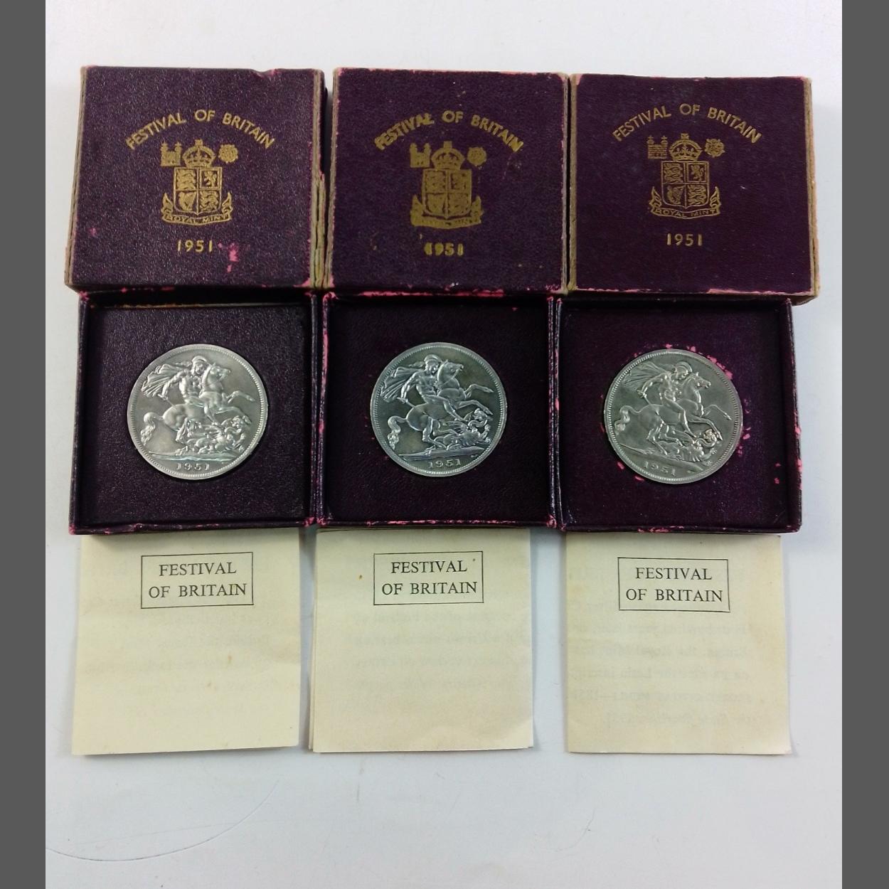 Three Festival of Britain 1951 crowns, all in boxes with paperwork