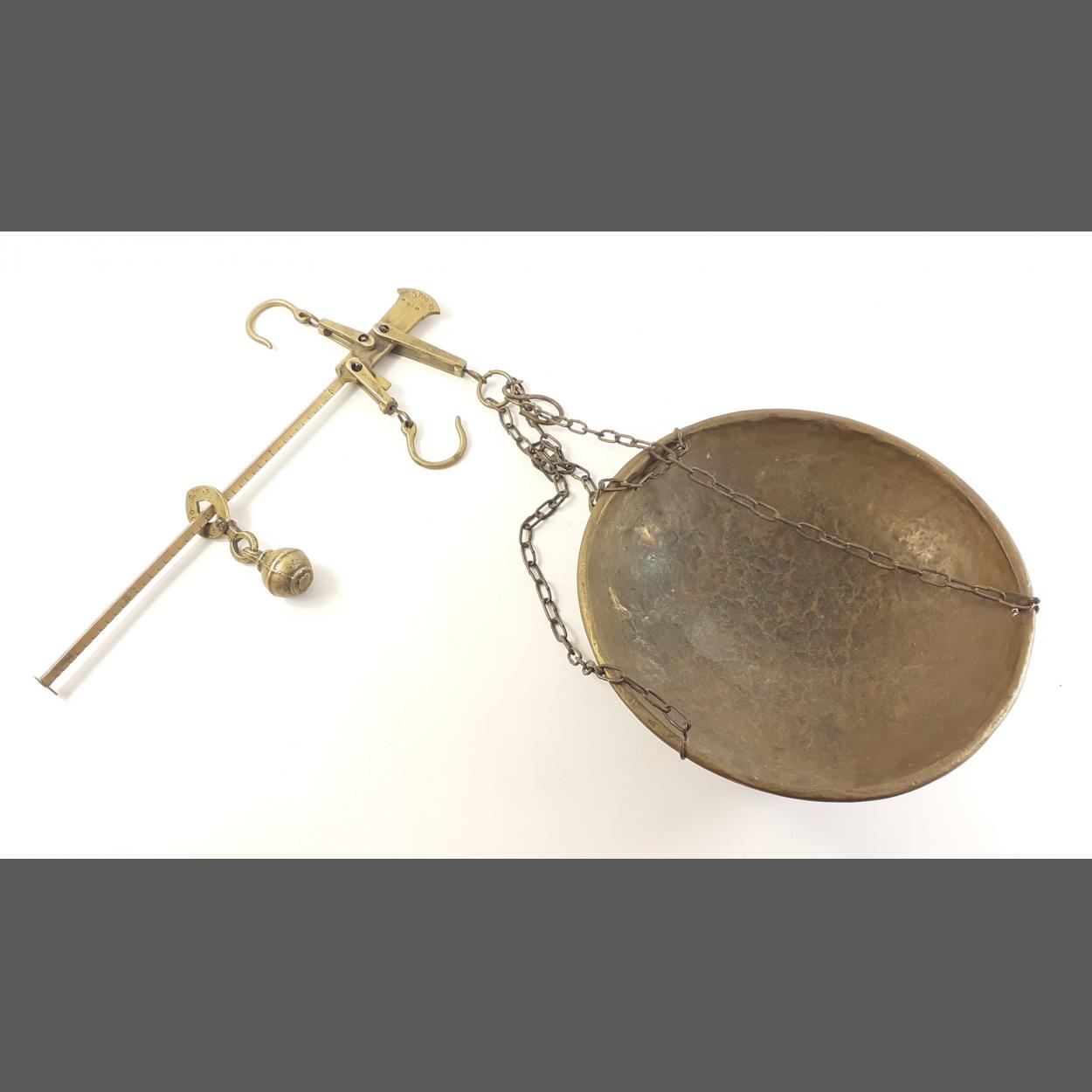 Georgian brass antique weigh scales with P 6.7 KG G.P. stamped on the measuring rod.