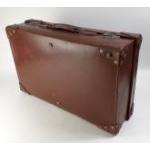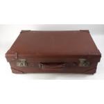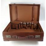 A top quality leather suitcase with re-enforced corners. Comes with lift out sections for vanity items including 5 glass bottles each with SILVER HALLMARKED lids, London 1929, weight 55g approx. Also includes a manicure set (minus scissors) and a bevelled hand mirror (slight crack to back). Case measures 66x40x20xm approx. A truly elegant piece of travel equipment.