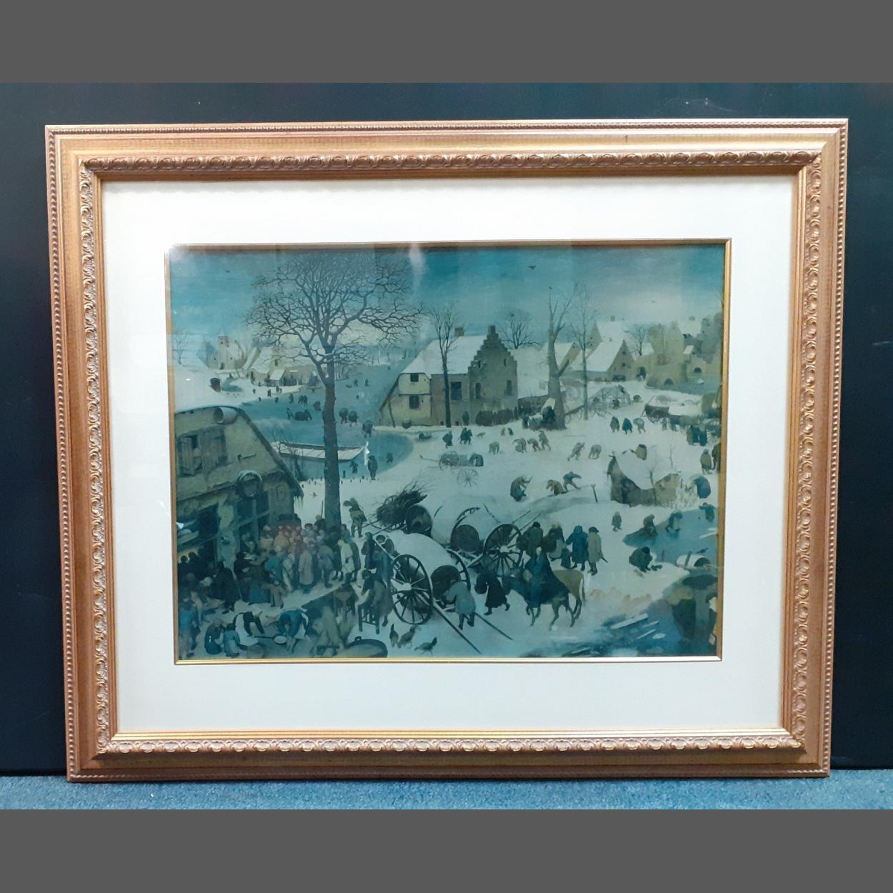 Modern large print of a winter scene by PIOTR BRUEGEL The Census at Bethlehem 83cm X 69cm approx. in attractive modern gilt frame