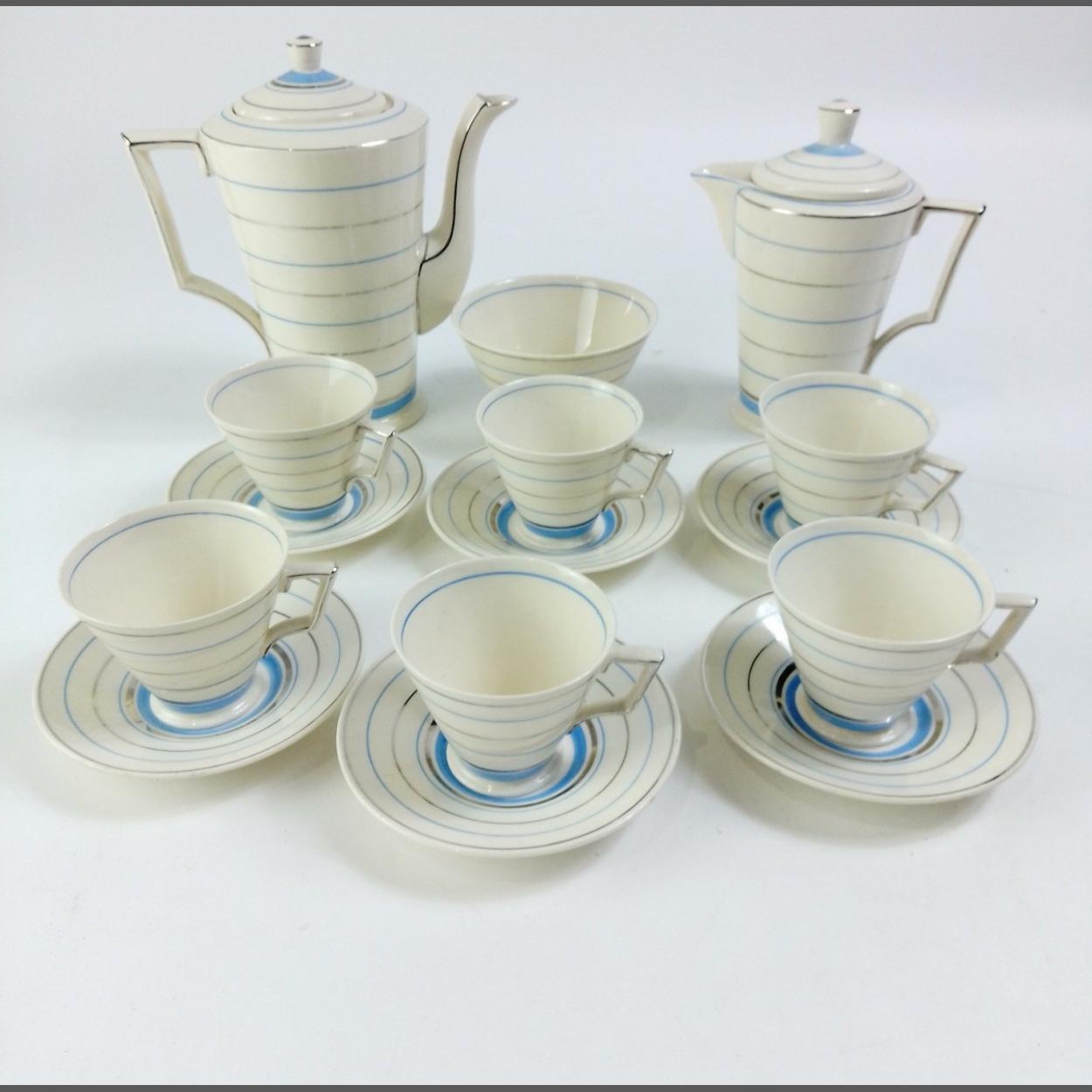 A vintage CORONA WARE coffee service with a circular blue and silver pattern, comprising 6 cups, 6 saucers, sugar bowl, coffee pot and hot milk jug. In excellent condition, a beautiful set
